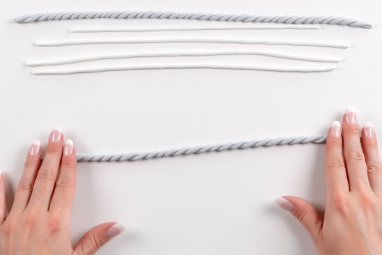1. Készítsünk mindkét színű gyurmából 12-12 db kb. 3 mm vastag rudat.