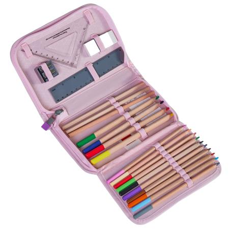 -feltöltött: 2 ceruza, 10 színes ceruza, 4 vastag színes ceruza, radír, hegyező, vonalzó és háromszöglető vonalzó
